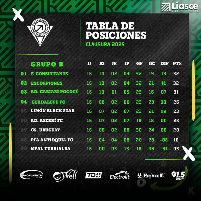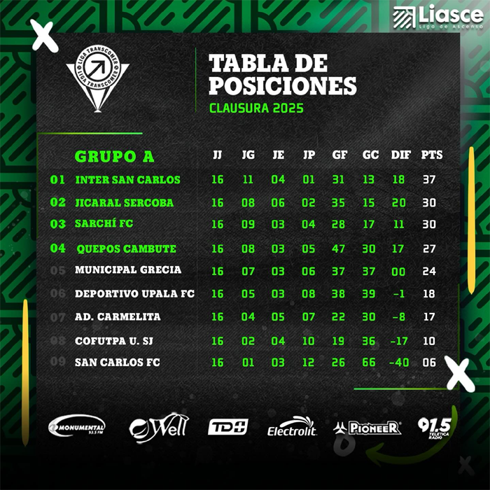 Municipal Grecia le endosó una nueva goleada, en esta ocasión, 3-7 ante San Carlos FC. Con dobletes de Andrey Mora (23', y 26'), Yosvani García (12', y 66'), y Farlen Salas (63', y 71') más un aporte de Osvaldro Barrantes (38') los griegos terminaron con victoria el certamen. Mientras sancarleños, que consumieron su descenso, maquillaron el resultado con dos goles de Henry Cooper (45', y 49') y autogol de Gael León (60').